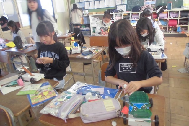 「夢の乗り物」のデザインを考えて、花の車やキッチンカーや汽車などそれぞれが考えた車に仕上げていました。