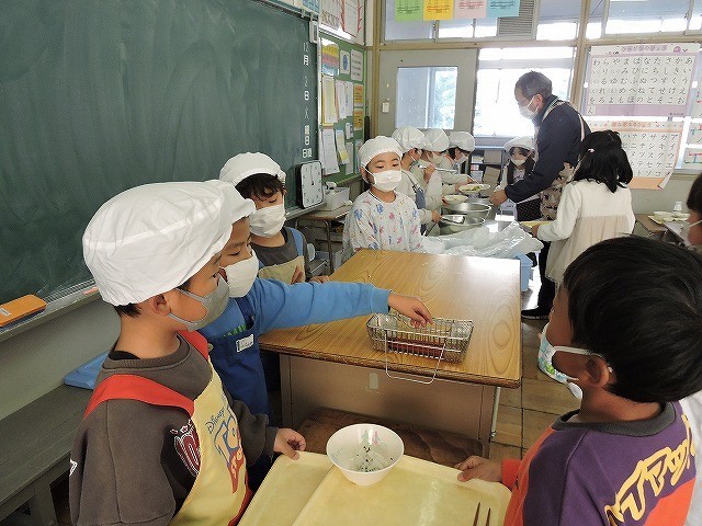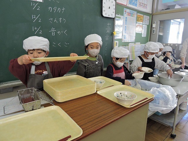 給食当番が1つずつ丁寧に盛り付けたり、配ぜんしたりしています。みんなで協力して準備するのは気持ちがよいですね。