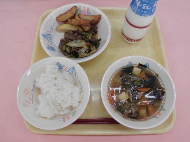 ごはん・牛乳・野菜たっぷり焼肉・ポテトフライ・わかめスープ