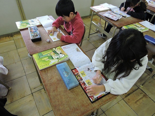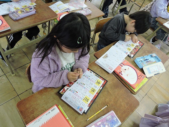 ドリルを見て、丁寧に正しく書いて覚えています。一文字一文字書き順に気を付けて、正しく書きました。集中して書いていると覚えられます。頑張りました。