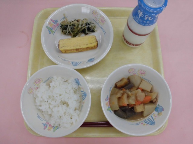 ごはん・牛乳・厚焼き卵・こんぶ和え・関東煮
