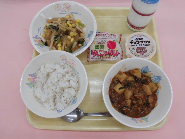 麦ごはん・牛乳・マーボードウフ・バンサンスー・セレクトデザート(りんごタルトorチョコプリン)