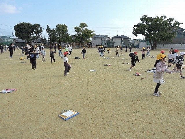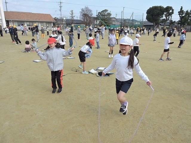 中間放課には、全校で一斉に「なわとびチャレンジ」に取り組んでいます。できる技や跳べる回数を増やそうと、みんなで努力を重ねました。少しずつできるようになると楽しいです。
