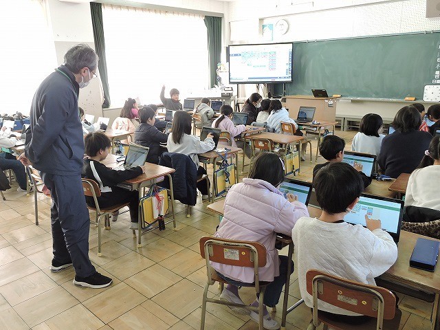 ICT支援員の先生とプログラミング学習をしました。キャラクターに指示を出すプログラムを考えて、自分の思うように動かしました。楽しく学べました。
