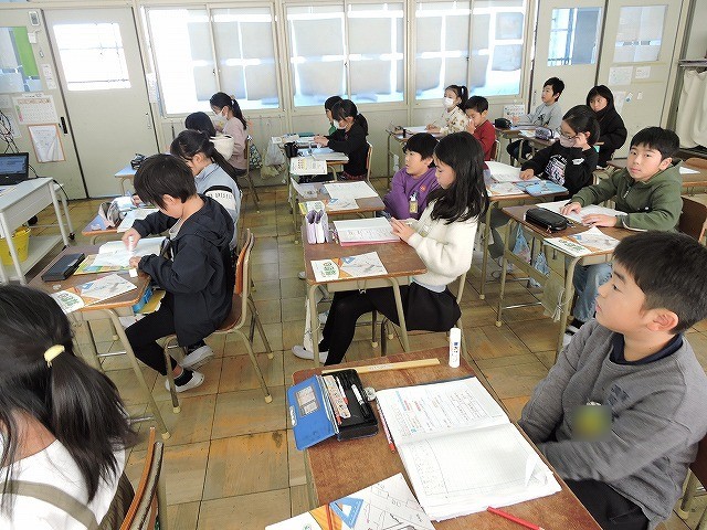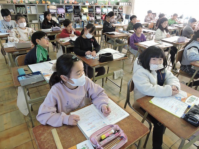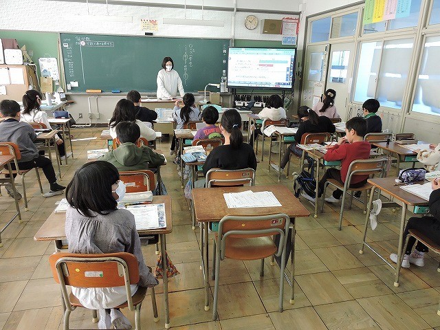 分数の学習をしています。分数をつかって長さを表しています。みんな真剣に学習に取り組んでいます。