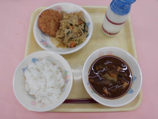 ごはん・牛乳・うきうきカツ丼の具(ひとくちカツ)・うきうきカツ丼の具(卵とじ)・一宮のみそ汁