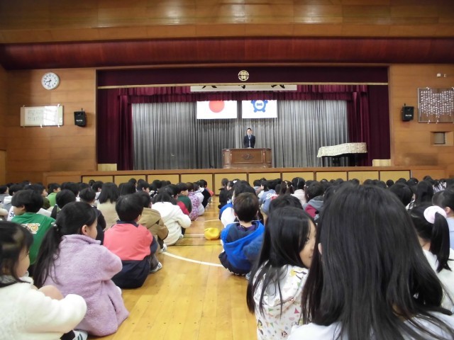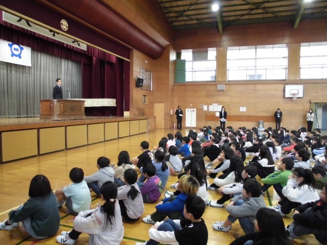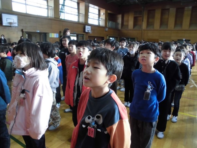 今までは教室でオンラインで行っていましたが、体育館に集まって終業式を行いました。