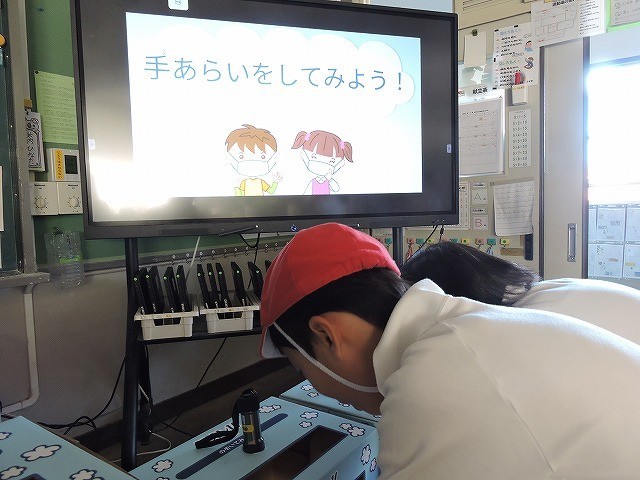発育測定を行いました。どれくらい成長しているかを確認でき、とてもうれしかったです。また、この季節に大切な「手あらい」の仕方についても教えてもらいました。手についた汚れを確認して、教えてもらった洗い方で丁寧に洗ったらとてもきれいになりました。教えてもらった手あらいの仕方で、健康に寒い季節を乗り切りたいと思います。