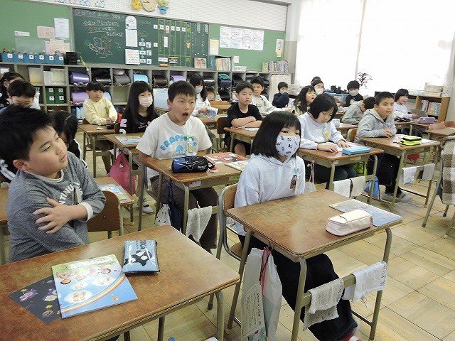 学習の始めには、あいさつとじゃんけんをします。「Rock Scissors Paper」と元気よく発声し、となりの子とじゃんけんをしました。みんな楽しく学んでいます。