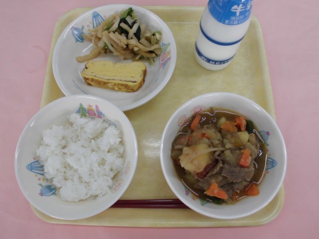 ごはん・牛乳・厚焼き卵・切干しだいこんの甘酢和え・肉じゃが