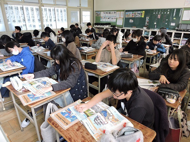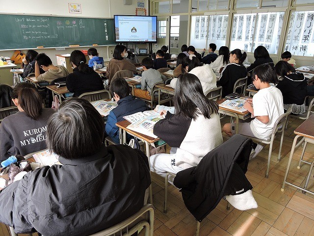 聞き取り問題に挑戦しています。どんな場所を紹介しているのかを一生懸命聞き取りました。また、その場所についてどのようなことを話しているのを聞き取り、テキストに書き入れました。
