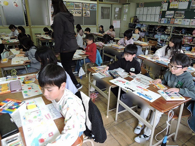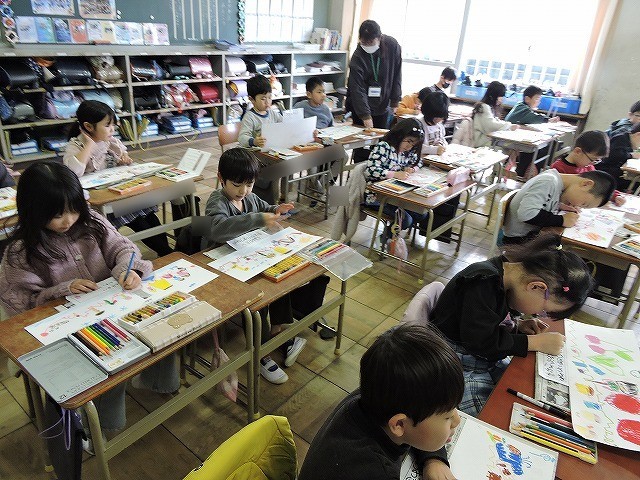 1本の線をかいて、そこから形や物語を考えて表現しました。自分の思った形や物語を目いっぱい楽しんで描きました。楽しかったです。