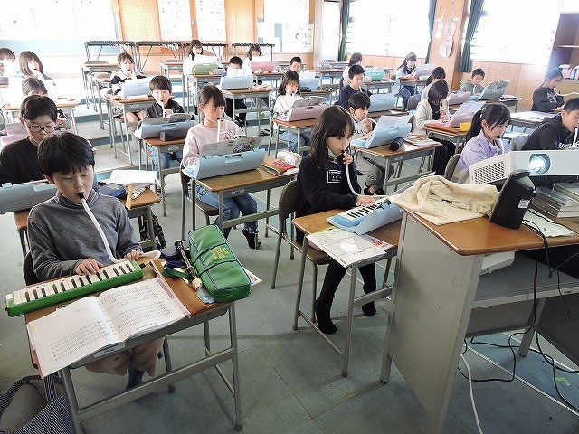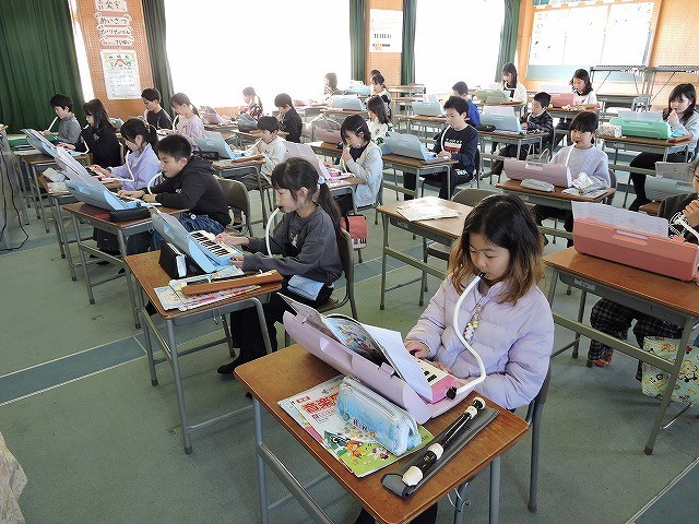 鍵盤ハーモニカで合奏に挑戦しています。みんなで息を合わせて、正しく演奏できるように集中して取り組みました。