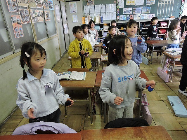 みんなで元気よく「おもちゃのチャチャチャ」を歌いました。「チャチャチャ」に合わせてカスタネットを奏でました。その後、「さんぽ」もみんなでつながって歌いました。来年の1年生に聞いてもらえるとうれしいです。
