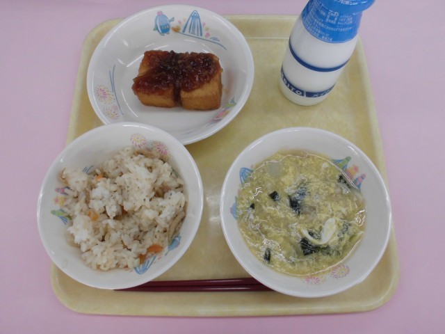 かきまわし・牛乳・生揚げのねぎしょうがだれ(1~3年1個、4~6年2個)・うきうきかきたま汁