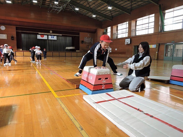 とび箱の練習をしました。平均台を使って腕支持と腰を高く上げる感覚をつかみ、着手と目線を意識してとび箱に挑戦しました。頑張りました。