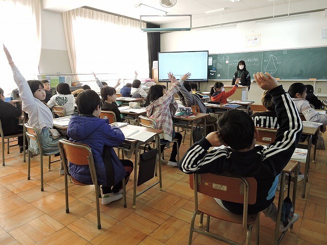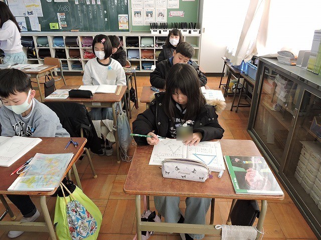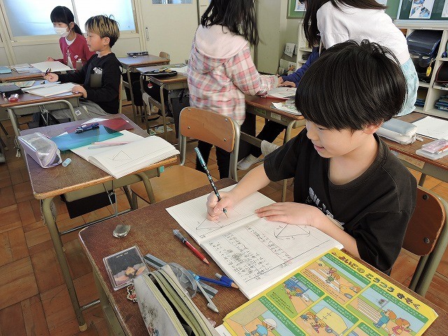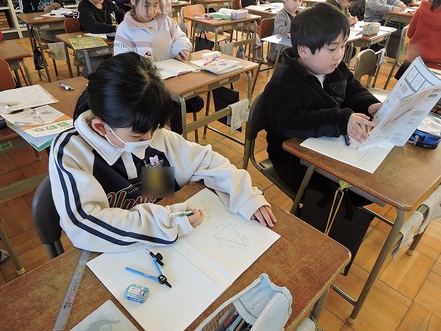 正三角形と二等辺三角形を作図しました。コンパスの性質を使って等しい長さの辺を書き入れました。作図で使った線がワイパーのように交わっているのが面白かったです。