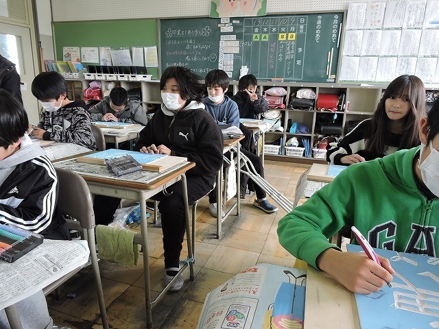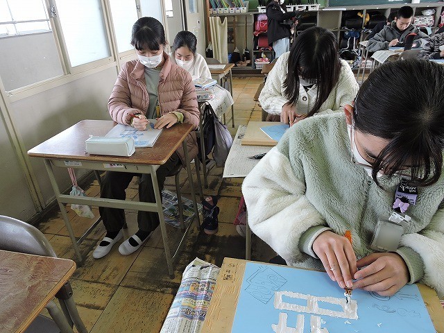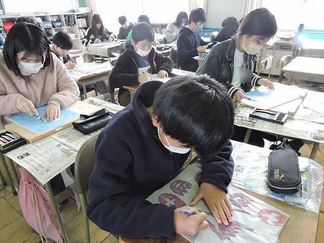 小学校生活を表す一文字を表現する作品づくりを頑張っています。アイデアや構図が決まり、いよいよ版を掘っていきます。安全に慎重に一彫り一彫り、小学校生活への感謝の思いを込めています。