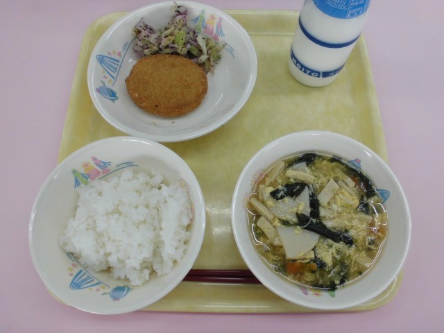 ごはん・牛乳・コロッケ・赤じそ和え・かきたま汁