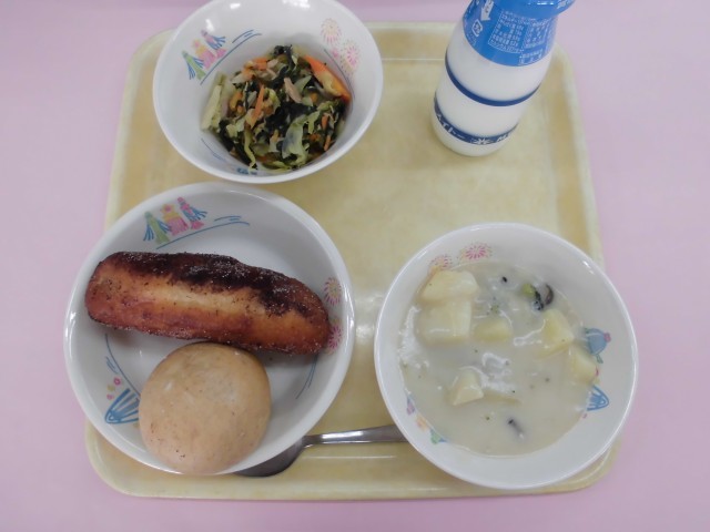 ココア揚げパン・プチパン(5・6年)・ほうれん草のソテー・ミートボールのホワイトシチュー