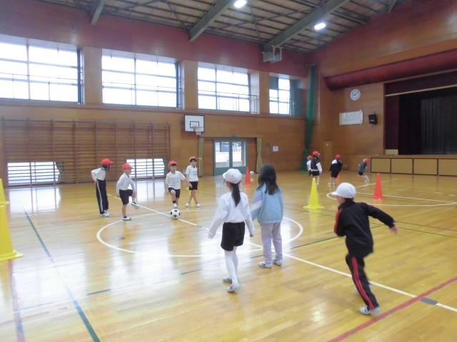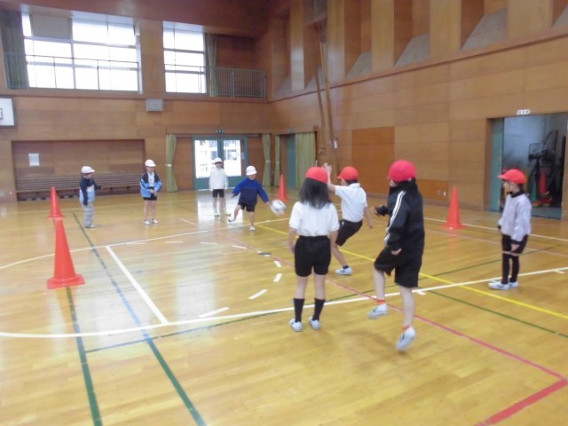 体育で、シュートゲームをしました。まずは、チームで作戦タイムです。コースを狙って思いきり蹴ったり、前後に広がって守ったりしようとみんなで考えました。点が入ると「やったー!!」と歓声があがり、点を取られたチームは声かけし合ってさらにがんばっていました。