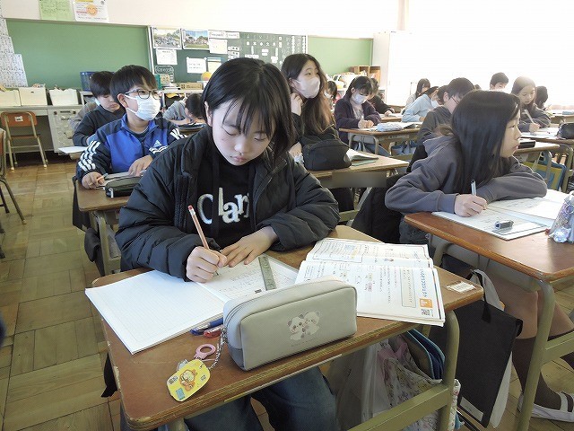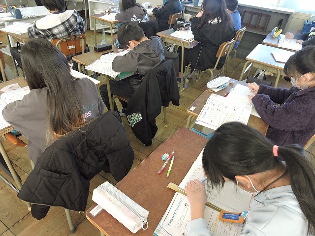 「ごみを減らそうプロジェクト」のタイトルでこれまでに学習したことを基にした文章問題に挑戦しました。総まとめの復習問題といった感じで手ごわかったのですが、みんな真剣に取り組みました。