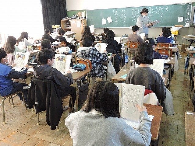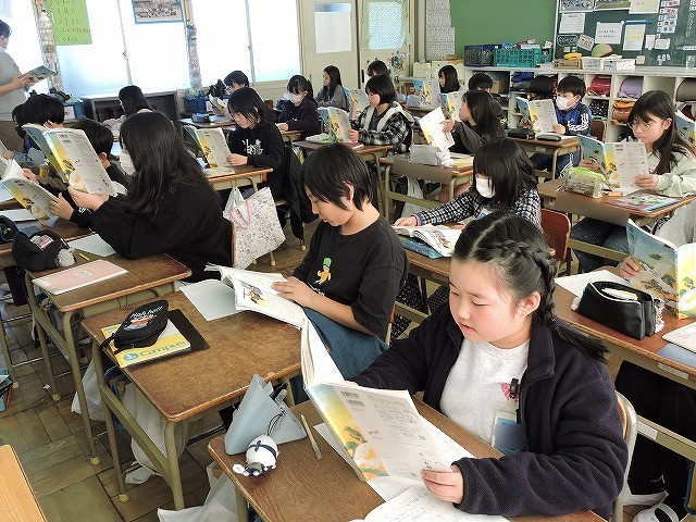 「スワンレイクのほとりで」の読み取りを学習しています。今日の読み取る部分の音読をしています。姿勢をよくすることでよい声で音読できますね。みんな頑張っています。