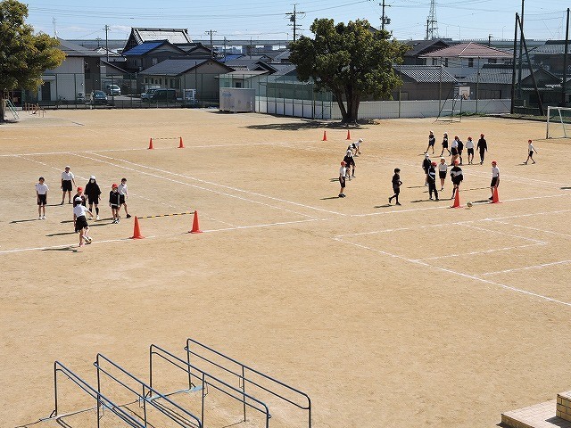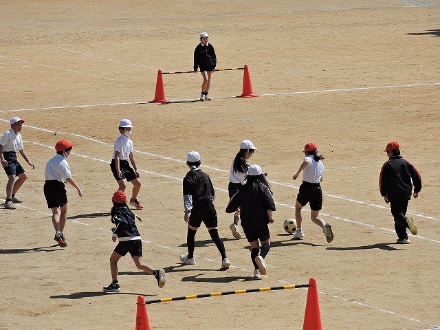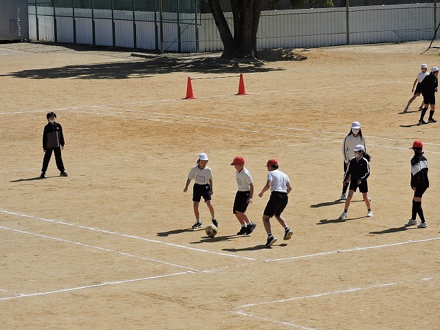 カラーコーンをゴールにしてミニコートでのサッカーをしました。相手と味方の動きを見て、パスやドリブルをしてゴールに迫りました。ボールを追いかけて白熱しました。