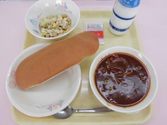 ミートボールシチューには、エネルギーのもとになる「じゃがいも」や、体の調子を整える「にんじん、たまねぎ、グリーンピース」などが入っています。ロールパンを小さくちぎって、シチューにつけて食べてもいいですね。まめまめサラダには、大豆、白いんげん豆、ひよこ豆が入っています。3種類の豆を見つけることはできましたか?豆類は、食物繊維や鉄分が多く含まれています。苦手な人も、少しは食べるようにしましょう。