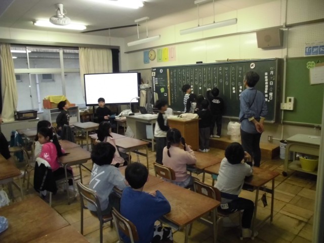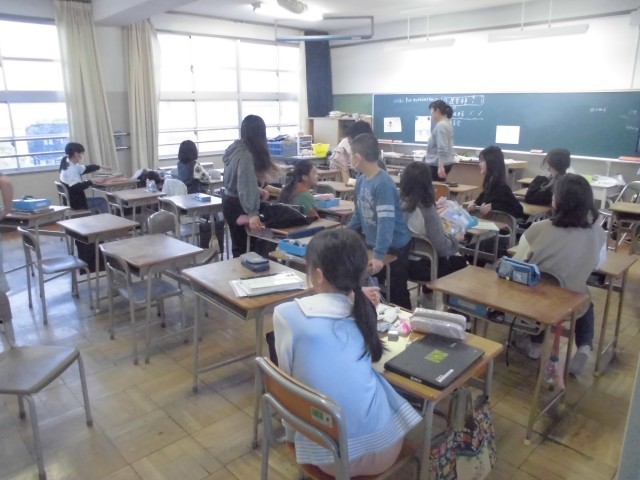 2日目は学活ばかりの一日です。とはいえ、内容は学年によって様々です。1年生では授業のはじめと終わりのあいさつの仕方やお道具箱の中身の確認をしていました。また、他の学年では、学級委員や係などを決めたり自己紹介のカードを書いたりしていました。また、高学年になると体の大きさがまちまちになってくるので、体にあった机の大きさになるように調整しているクラスもありました。