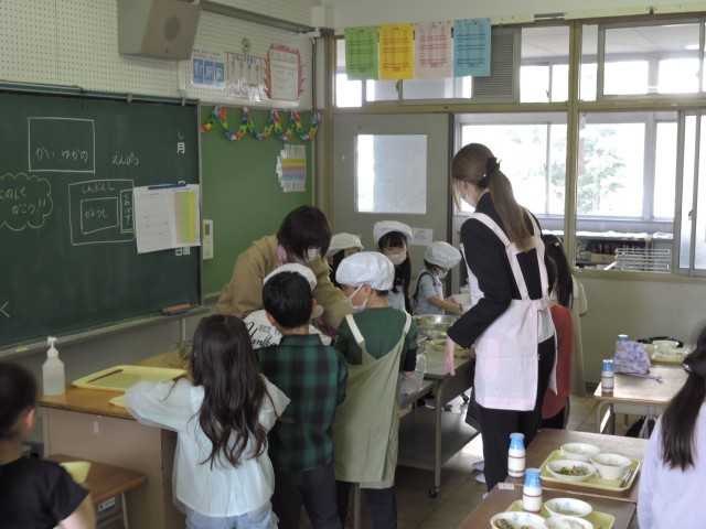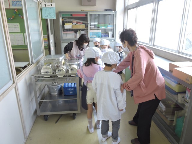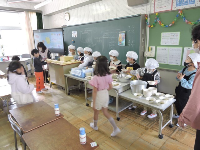 給食が始まり、今日が3回目となりました。3回目とはいえ、1年生はまだまだ準備に慣れておらず準備に時間がかかるため、4時間目から準備を始めます。慣れない中でも、一人一人が一生懸命、それぞれの仕事に取り組んでいます。