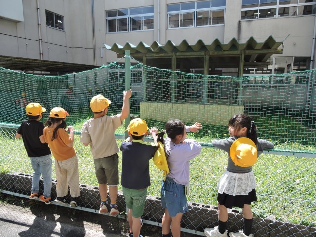晴れた日には長い放課になると、飼育小屋から広い運動スペースに出てきます。子どもたちにも人気で、今日の放課にも、多くの子がチャロンの飼育スペースに集まっていました。