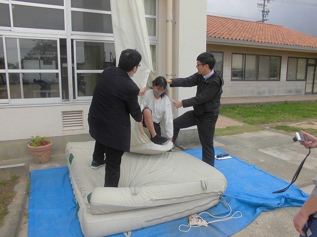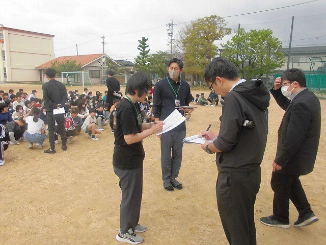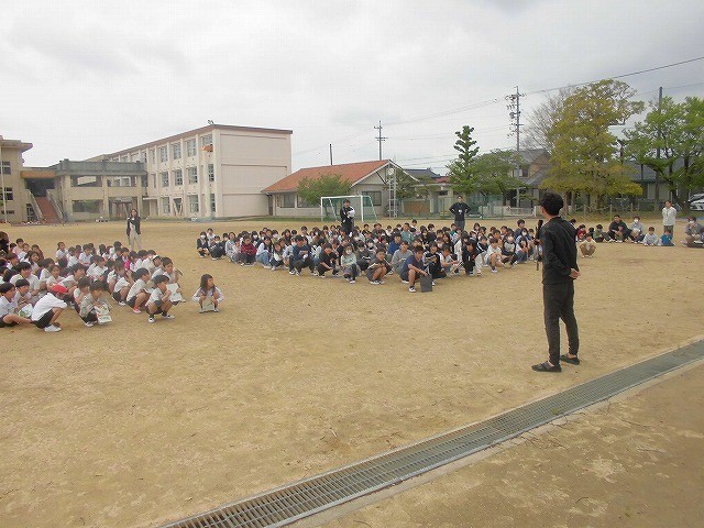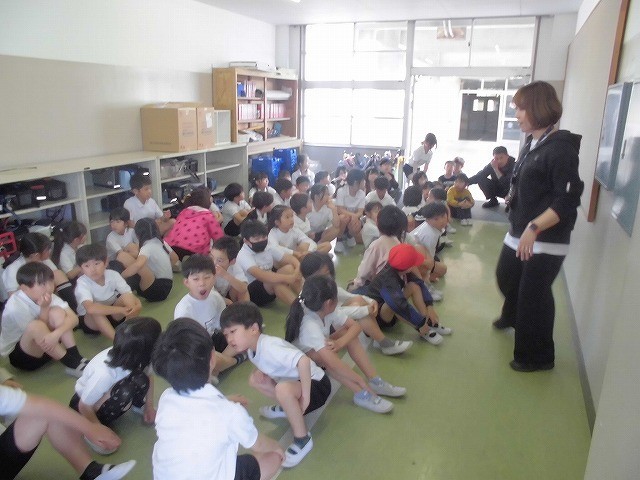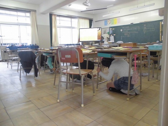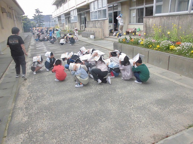 今日の2時間目に地震を想定した避難訓練を行いました。みんな真剣に運動場に避難できました。避難時に余震が起きた場合のシェイクアウト訓練も行いました。全員の無事を確認後は、担当の先生のお話を聞きました。その後は、各学年で救助袋や非常扉を使った訓練を行いました。