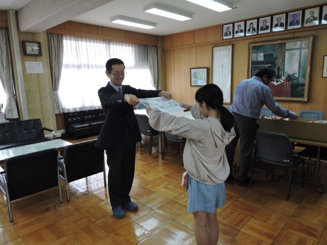 校長室で、野球と空手の大会で優秀な成績を納めた子たちの表彰を行いました。