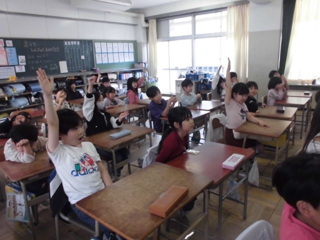 2年生になって初めての英語の授業でした。音楽に合わせて体を動かしたり、動物クイズに元気よく答えたり英語を楽しんでいました。