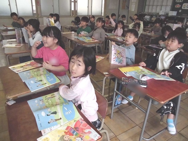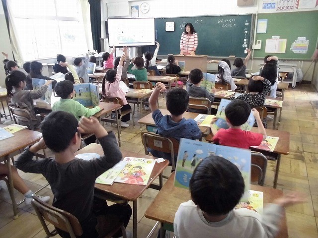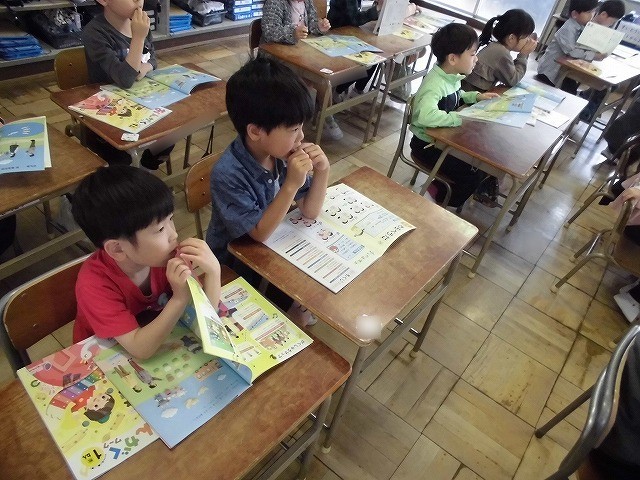 音楽の授業のスタートです。はじめはよく知っている「かえるのがっしょう」をみんなできいた後に元気よく歌いました。楽しく歌えました。