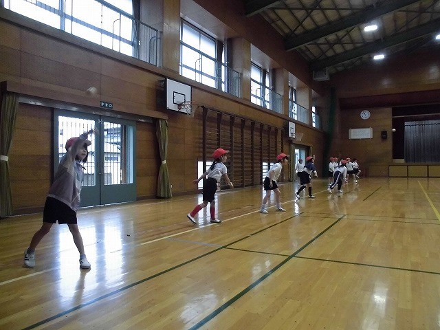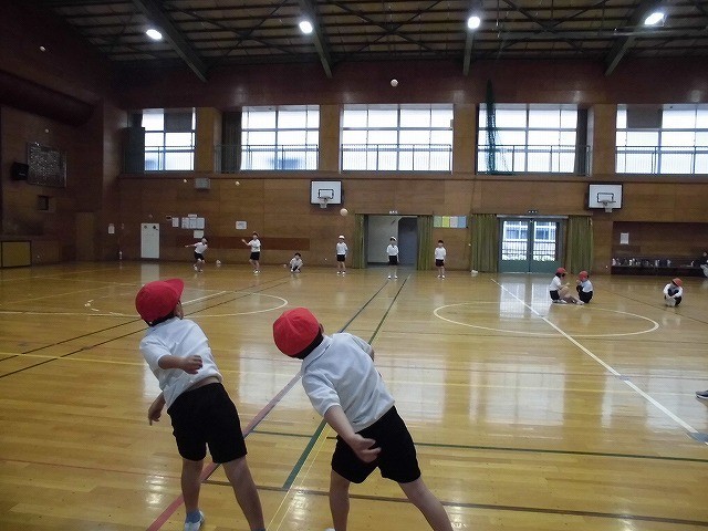 ボール投げをしました。ソフトテニスボールを使ってキャッチボールをしました。距離をだんだん長くしてどこまで届くのかを試しました。斜め上に投げるとよいことがわかりました。
