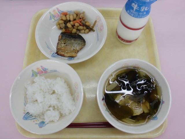 ごはん・牛乳・さばの塩焼き・五目煮豆・わかたけ汁