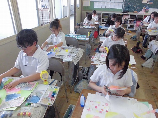 水彩絵の具を使って、その色の濃淡や配色を考えてさまざまな心の状態を表現しました。それを1枚の色画用紙に貼り合わせて作品の完成です。素敵な作品がたくさん出来上がりました。