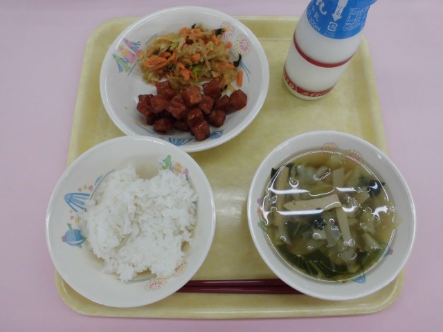 ごはん・牛乳・生揚げのヤンニョム・チャプチェ・中華スープ