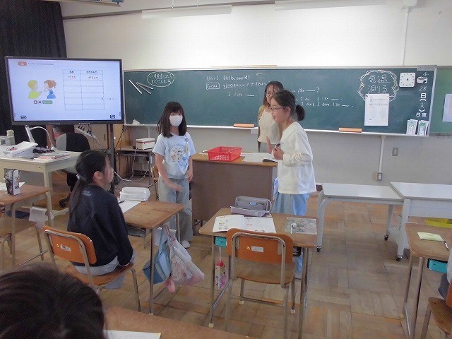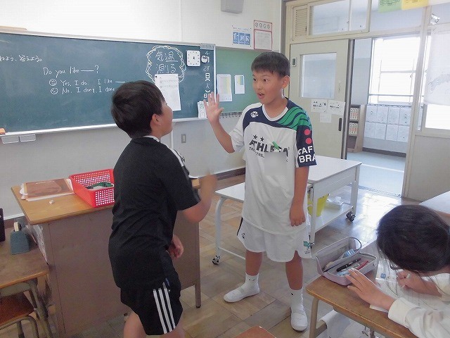 自分の好きなことを紹介する言い方を覚えました。練習をしたらペアで発表です。みんなの前で進んで発表できる人がたくさんいて、すばらしいと思いました。