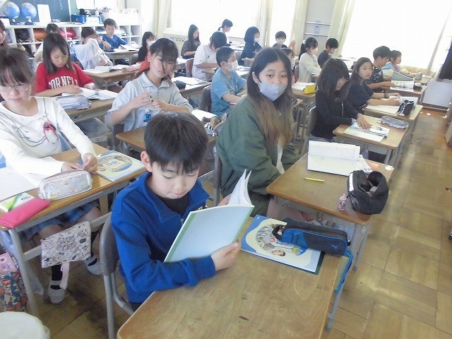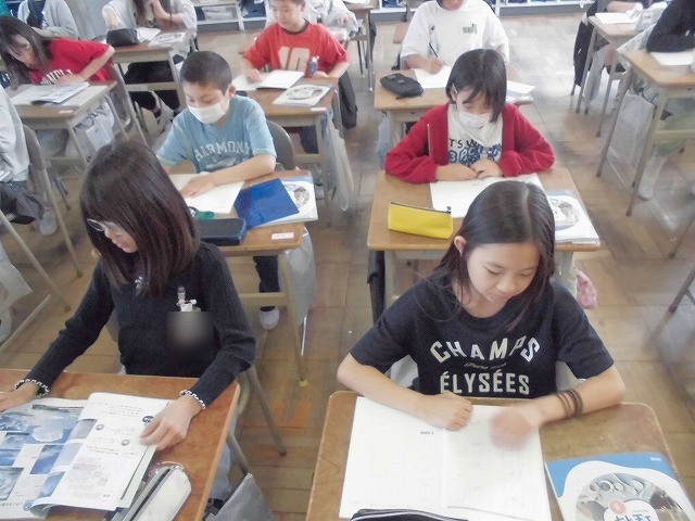 チャイムが鳴ると同時に号令がかかり、礼が終わるとすぐに机上の学習用具の準備をします。さすが5年生です。集中して学習に向かっています。