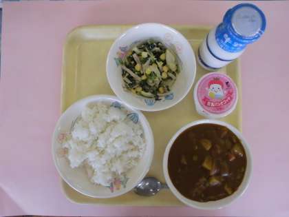 今日の献立は「ビーフカレーライス・牛乳・ほうれんそうの元気サラダ・お祝いデザート」です。