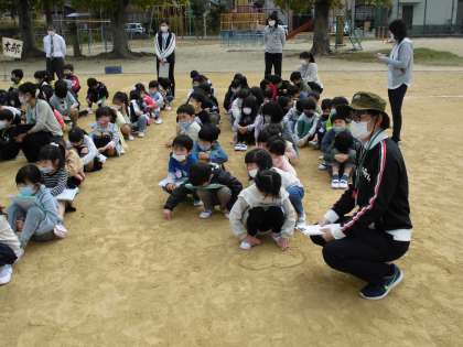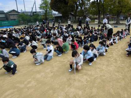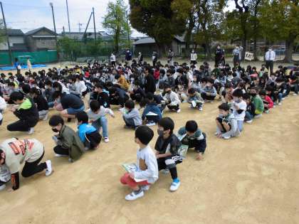 今年度初めての避難訓練を行いました。運動場に避難・集合しました。