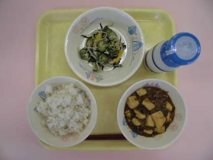 今日の献立は「麦ご飯・牛乳・マーボードウフ・ひじき入りバンバンジー」です。