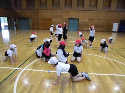 体育の授業で、表現を入れた楽しい「進化ゲーム」をしました。「たまご」からじゃんけんをしながら「幼虫」「さなぎ」「成虫」と進化していくゲームです。成虫になると蝶々になって羽ばたきながら、のぼり棒につかまります。子どもたちは、みんな熱中して参加しました。