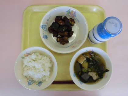 今日の献立は「ご飯・牛乳・けんちん汁・まぐろといかのみそがらめ」です。