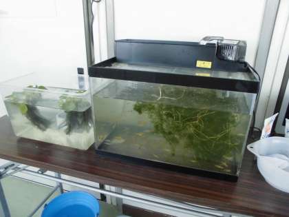 理科の授業では、メダカのたんじょうについて学習しています。今週からは、5年生の教室前のろう下で、メダカのお世話が始まりました。子どもたちは、メダカに興味津々で、休み時間になると水そうをのぞき込む姿が見られます。