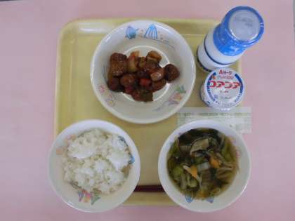 今日の献立は「ご飯・牛乳・五目中華スープ・肉だんごの甘酢あん・ヨーグルト」です。