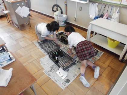 1・2年生からもらった花や野菜の苗を分けて持ち帰る準備をしました。